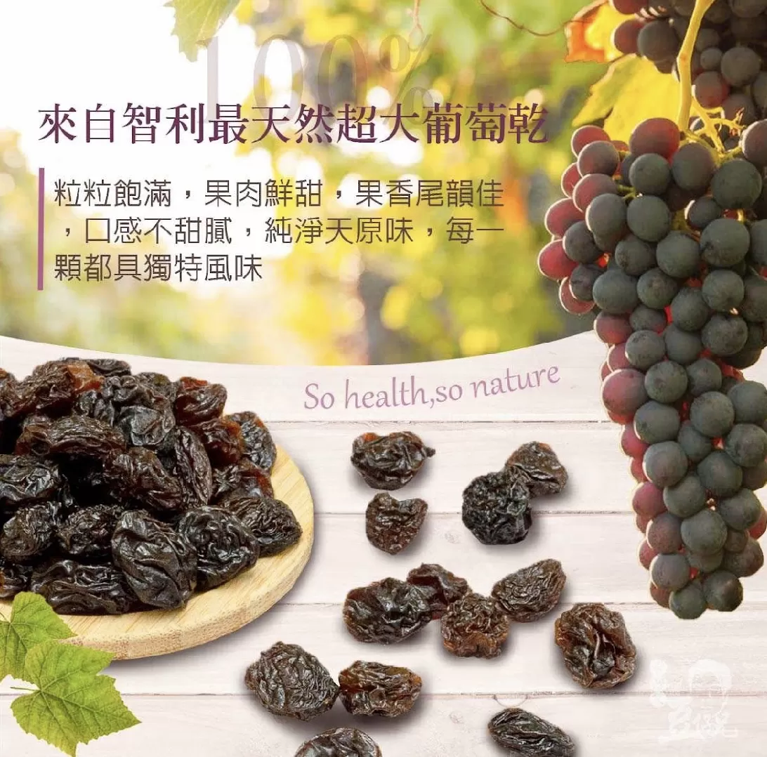 來自智利天然的滋味,一顆顆飽滿的葡萄,香甜Q彈,無再額外添加糖,健康無負擔;葡萄營養豐富,含有維他命A、B1、B2、B12、C、E、 β -胡蘿蔔素、蛋白質,以及鈣、鎂、鉀、磷、鐵等多項礦物質。