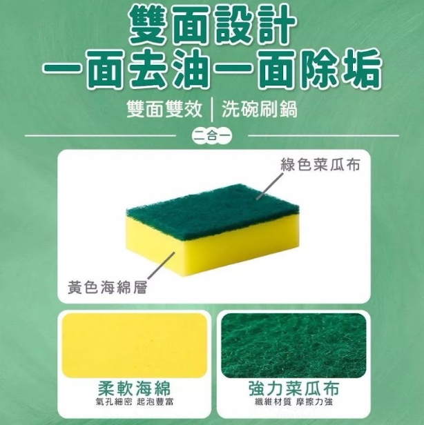 雙面強效去油:菜瓜布深層去除種油漬,海綿清潔表面殘留。